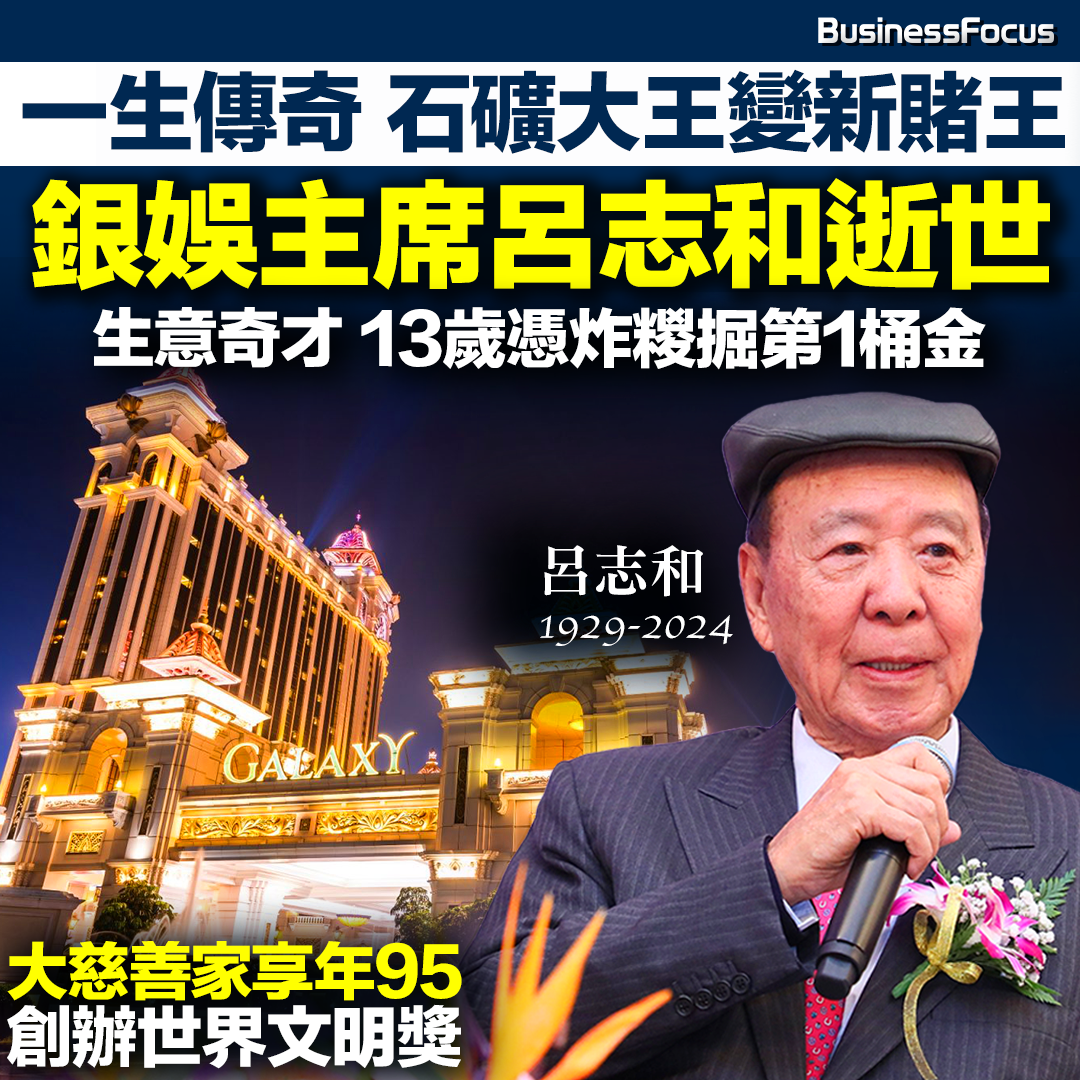 有「新賭王」之稱的銀河娛樂(0027)創辦人兼主席呂志和,上周四(11月7日)安詳辭世,享年95歲,結束這位著名企業家及慈善家跌宕起伏的傳奇一生。4歲時隨家人來港的呂志和,13歲已展現生意奇才,憑創意炸糉掘第1桶金。大膽及不服輸的性格更令他屢次戰勝逆境,成為香港石礦大王及酒店大亨,其後更進軍澳門,憑「銀河娛樂」晉身新賭王。令人更敬重的是,呂志和一生積極扶助弱勢社群,至晚年仍大力推動慈善事業,包括於2015年創立「呂志和獎:世界文明獎」,以表揚對文明進步、可持續發展及人類福祉作出重大貢獻人士。而為表揚這位慈善富豪的貢獻,中國科學院紫金山天文台把國際編號5538的小行星命名為「呂志和星」,意味他的精神可永恒照耀人間。