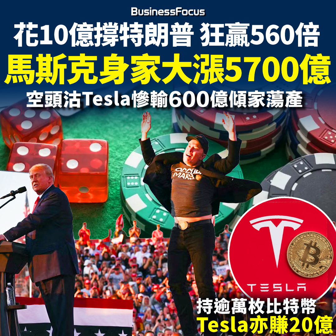 【最強賭神】首富馬斯克花10億撐特朗普 狂贏560倍 身家大漲5700億 空頭沽Tesla慘輸600億傾家蕩產
