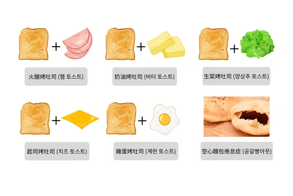 目前在社交平台或各大論壇上,韓國人多以自我調侃形式來表達自身的「Toastout」狀態,甚至衍生出各種「口味」的烤吐司迷因,每樣都代表著不同的倦怠感。例如「生菜烤吐司」(양상추 토스트,形容自己像被夾在吐司裡的軟爛生菜,無力而無精打采;或是「雞蛋烤吐司」(계란 토스트),形容因繁忙耗費過多體力,需要補充新能量;甚至還有「空心麵包」(공갈빵아웃)的説法,指熬夜或過度工作,導致大腦當機無法再運轉。