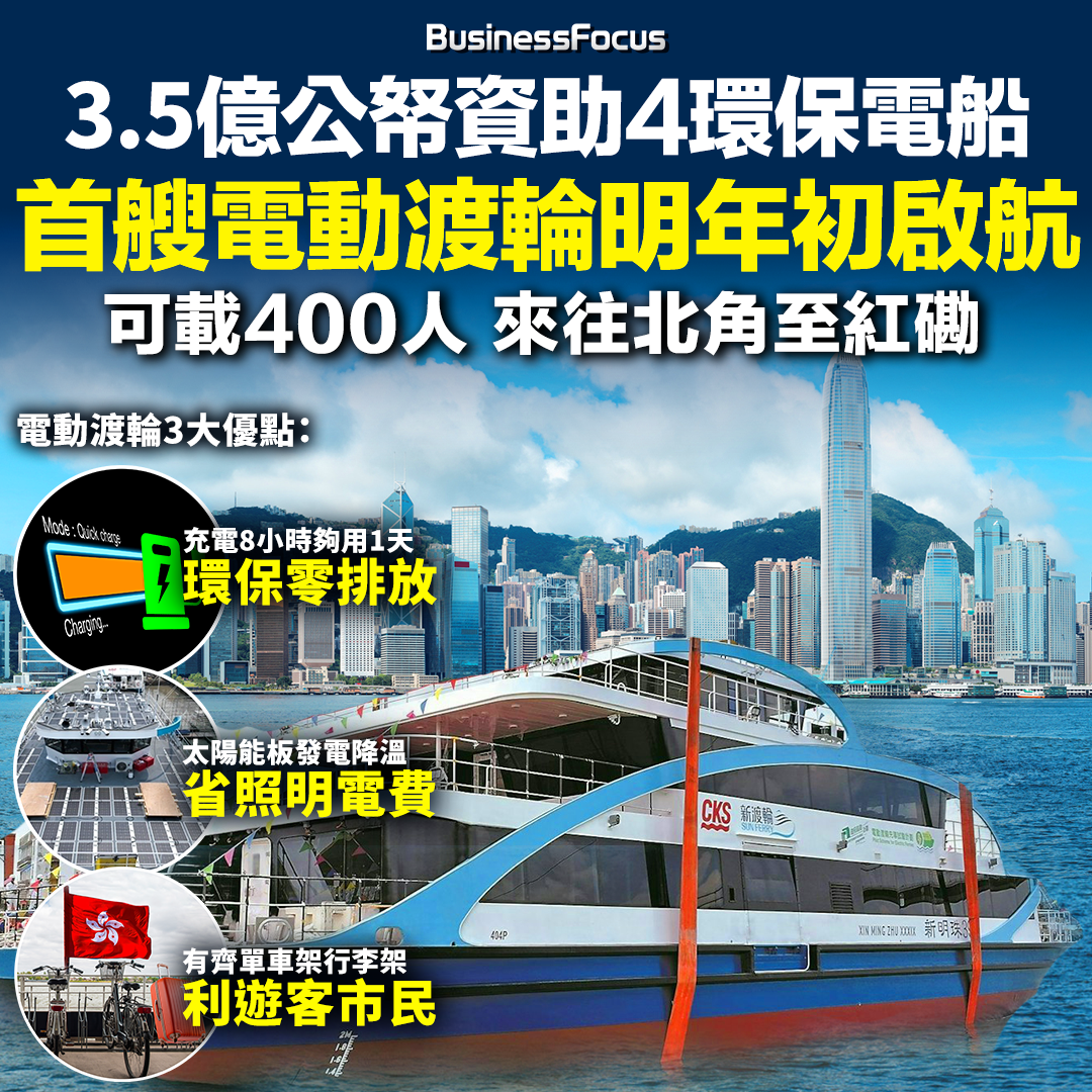 資助總額達3.5億元「電動渡輪先導試驗計劃」,共涉及4間公司4艘電動渡輪。除了將率先於明年初投入服務的新渡輪公司「新明珠39」將參與的北角與紅磡航線之外,其他3條參與試驗的包括「珊瑚海船務」來往西灣河至觀塘的航線;天星小輪來往「中環至尖沙咀」的航線;以及富裕小輪行駛於啟德、紅磡、尖沙咀、中環及西九龍的水上的士。其中「富裕小輪」及「珊瑚海」已完成電動渡輪的採購並正在造船,天星則已展開建船的公開招標程序。