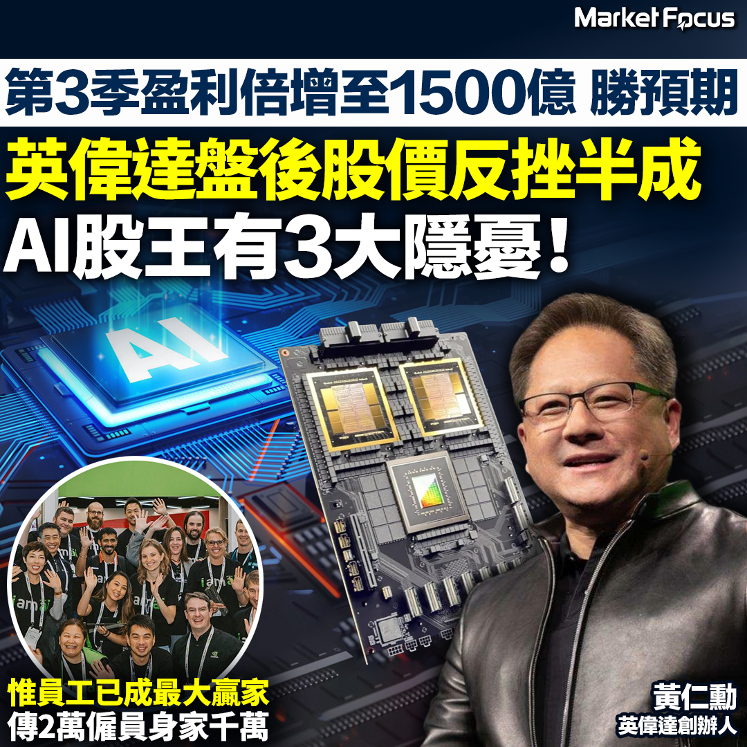 【神話不再?】季度盈利暴增1倍至1500億 英偉達盤後股價反挫半成 AI股王有3大隱憂惟員工已成最大贏家 傳2萬僱員身家千萬