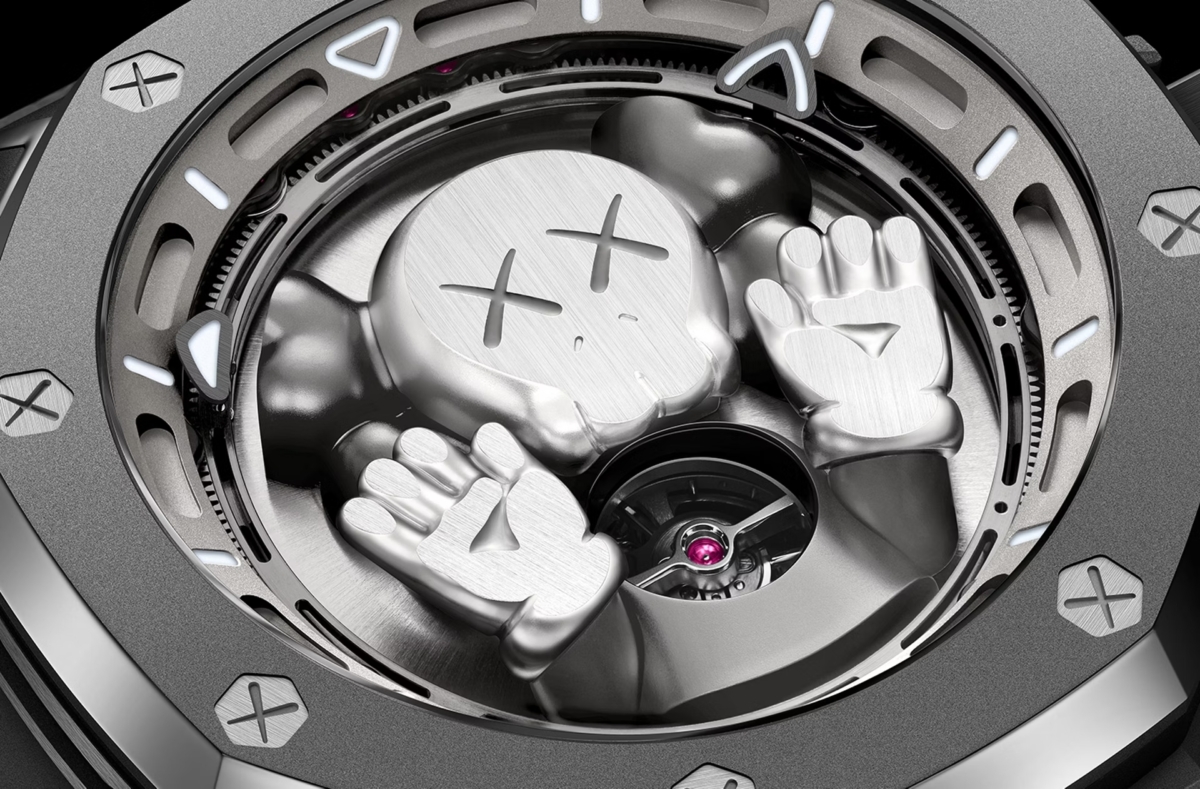 AP X KAWS採用鈦金屬打造的聯名腕錶以Companion為視覺中心,將KAWS的元素多方位融入設計中。為使Companion更加突出,愛彼創新開發了2979手動上鏈機芯,把時針和分針移至錶盤的外緣,配合位於錶面6點鐘位置的陀飛輪相互建構而成。兩個可見的交疊齒輪互相牽引,驅動著時針和分針圍繞著機芯和錶面的外圍旋轉,使面盤中央完全留給Companion立體雕塑,成為絕對的視覺焦點。