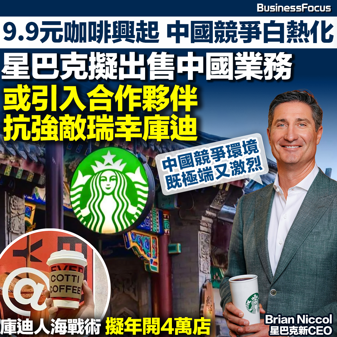中國9.9元超廉價咖啡興起,加上國內業者以「人海戰術」狂開分店,令到全球咖啡店龍頭公司星巴克(Starbucks,美股:SBUX)也難以招架,星巴克新任行政總裁Brian Niccol(尼科爾)早前即形容中國的競爭及環境「極端、艱難」。據外媒《彭博》等報道,星巴克有意仿效麥當勞(美股:MCD)數年前的做法,考慮出售國內業務,又或是引入合作夥伴,以尋求結合第三方力量對抗國內的強敵以及「減價戰」。但究竟星巴克會否出售國內部分或全部業務權益,據悉暫仍未有最後決定。