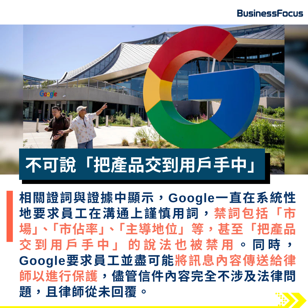 在限制員工遣詞用字方面,Google的要求也十分嚴格。根據2011年的一份名為「給搜尋團隊的反壟斷基礎知識」的備忘錄顯示,該公司建議員工避免使用涉及「戰爭或體育競賽、帶有明顯輸贏色彩」的比喻,也嚴令禁止提到「市場、市佔率、主導地位」等敏感用詞。甚至在新員工的培訓教程中,「把產品交到用戶手中」的說法也被禁用,理由是「可能被解讀為剝奪消費者意願」。