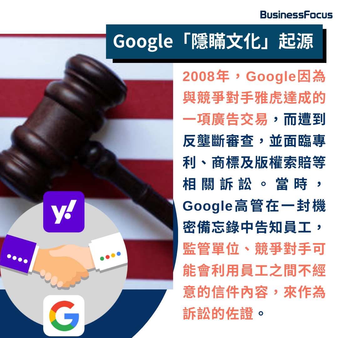 報道指出,2008年年底,Google因為與競爭對手雅虎達成的一項廣告交易,而遭到反壟斷審查,並面臨專利、商標及版權索賠等相關訴訟。當時,Google高管在一封機密備忘錄中告知員工,監管單位、競爭對手可能會利用員工之間不經意的信件內容,來作為訴訟的佐證。因此,該公司希望員工在信中討論一些「熱門話題」時,應避免猜測或諷刺性的言論,「在掌握事實真相之前,不要發表評論」。同時,Google內部的通訊工具也設定為私密,內部言論將在隔天被刪除。