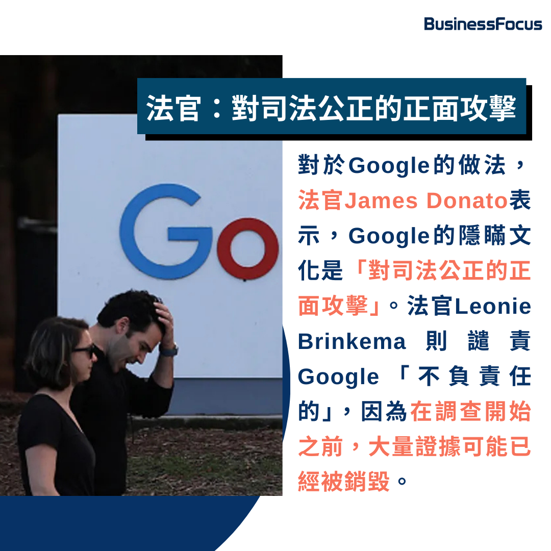 其中包括,Google鼓勵員工在文件中利用與律師的秘密溝通豁免權(Attorney-Client Privilege),始終將Google法務添加到收件人名單中,即便信件內容完全不涉及法律問題,且律師從未回覆。同時,企業在預計到會遭遇訴訟時,通常需要保留相關文件,但Google卻將即時通訊記錄排除在外。