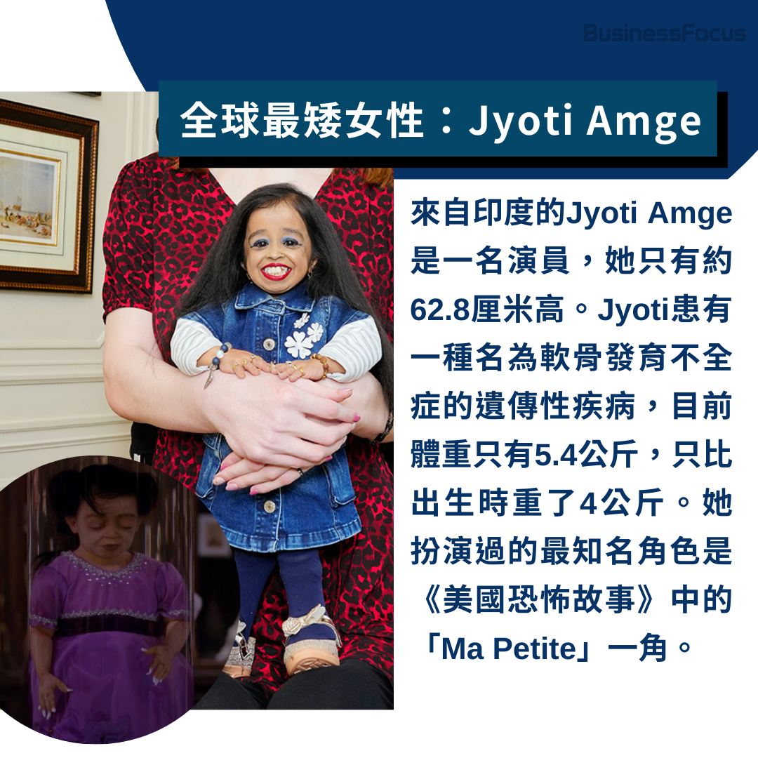 至於全球最矮的女性,則是來自印度的Jyoti Amge。她只有約62.8厘米高,於2013年首次獲健力士認證為全球最矮女性。Jyoti出生時本是個體型正常的孩子,但隨著年齡增長,她的父母發現她的生長速度明顯慢於同齡人。經診斷後發現,Jyoti患有一種名為軟骨發育不全症(achondroplasia)的遺傳性疾病。16歲時,她的身高僅為61.95厘米,直到18歲才長到62.8厘米,並且體重只有5.4公斤,只比出生時重了4公斤。目前,她是一名演員,最廣為人知的角色是在《美國恐怖故事》中扮演的「Ma Petite」一角,為她在荷里活乃至全世界打響了知名度。