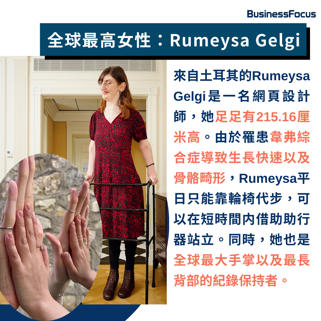 健力士世界紀錄最高女性的保持者,是來自土耳其的Rumeysa Gelgi,她足足有215.16厘米高,於2014年首次獲得全球最高女性的頭銜,並維持至今。由於罹患韋弗綜合症(Weaver Syndrome)導致生長快速以及骨骼畸形,Rumeysa平日只能靠輪椅代步,可以在短時間内借助助行器站立。即便如此,Rumeysa始終積極面對生活,從小接受家庭教育的她,目前是一名合格的網頁設計師。同時,她也是全球最大手掌以及最長背部的紀錄保持者。