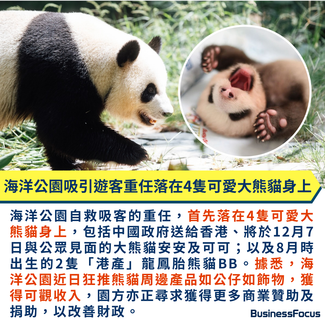 不過籌建新遊樂設施乃「遠水難救近火」,故短期內海洋公園「自救」吸引更多遊客的重任,便落在4隻可愛大熊貓身上,當中包括中國政府最新送給香港、將於12月7日與公眾見面的大熊貓安安及可可;以及8月時出生的2隻「港產」龍鳳胎熊貓BB。據悉,海洋公園近日狂推熊貓周邊產品如公仔如飾物,更火速批出版權予第3方製作熊貓精品,從中獲得可觀收入。其中在K11 Musea專賣店推出售價1,488元的仿真熊貓,竟也賣至斷市,令人鼓舞。故海洋公園正籌劃各種大計,望把「熊貓經濟」效益發揮到最大。