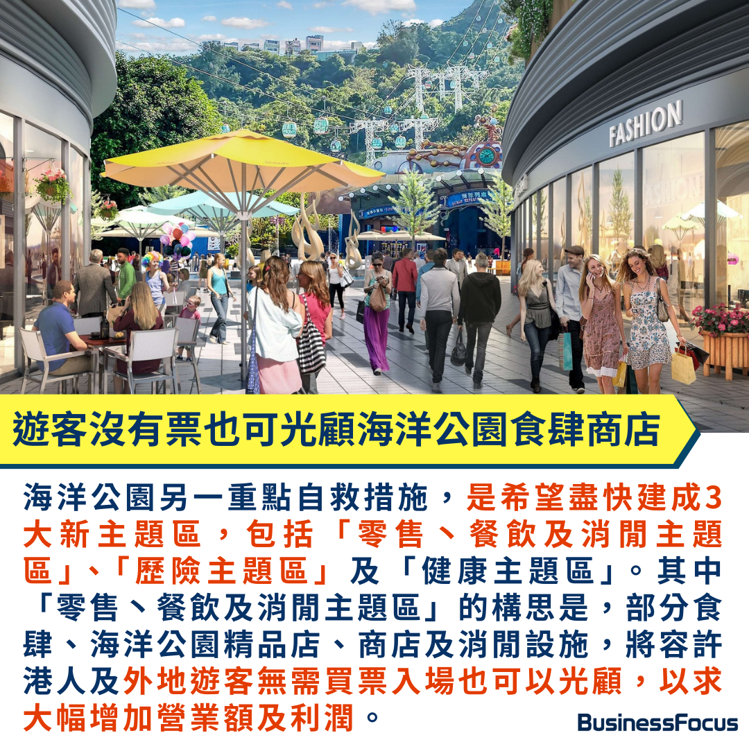 海洋公園另一重點自救措施,是希望盡快建成3大新主題區,包括「零售丶餐飲及消閒主題區」、「歷險主題區」及「健康主題區」。其中「零售丶餐飲及消閒主題區」的構思是,部分食肆、海洋公園精品店、商店及消閒設施,將容許港人及外地遊客無需買票入場也可以光顧,以求大幅增加營業額及利潤,也希望藉此把海洋公園外圍打造成免費消閒購物區。
