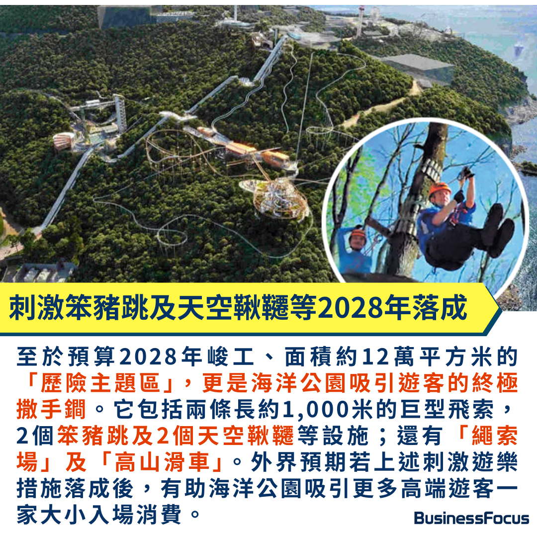 至於今年內動工、預算2028年峻工的「歷險主題區」,更被視為海洋公園吸引遊客的終極撒手鐧。因為近年亞洲國家旅遊點紛紛提供刺激玩意,香港的海洋公園遂急起直追。面積約12萬平方米「歷險主題區」,包括兩條長約1,000米的巨型飛索,可穿越水上樂園及叢林等;在「滑浪飛船」舊址更會建造兩個笨豬跳及兩個天空鞦韆等設施;此外,機動遊戲「越礦飛車」舊址則會改建成「繩索場」,旁邊會有「高山滑車」。外界預期若上述刺激遊樂措施落成後,料有助海洋公園吸引更多高端遊客一家大小入場消費。