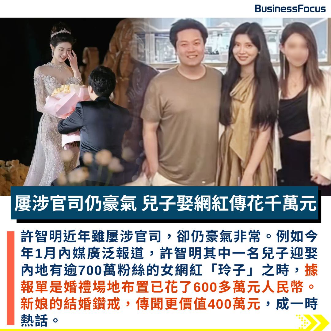 不過許智明縱然官司不絕,卻依然是豪氣非常。例如今年1月內媒廣泛報道,許智明其中一名兒子迎娶內地一名有逾700粉絲的女網紅「玲子」。當時據報單是婚禮場地布置已花了600多萬元人民幣,新娘戴的結婚鑽戒價值亦據報高達400萬元。故這場花費超過1,000萬人民幣的婚禮,曾成為內地網上熱話。