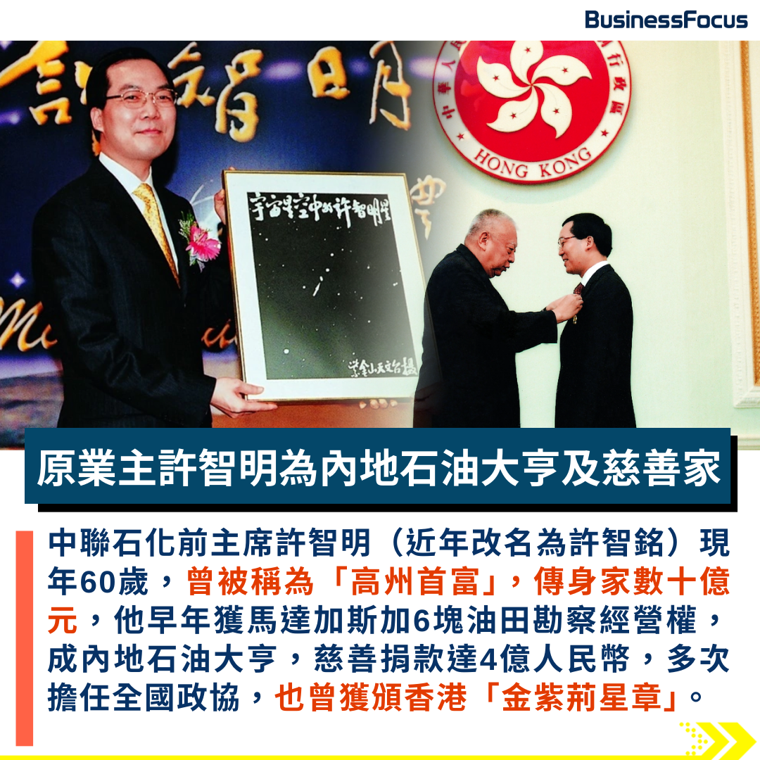曾是中聯石化前主席以及上市公司凱富能源集團前主席的許智明(近年改名為許智銘)現年60歲,人生極為傳奇。他曾被稱為「高州首富」,有傳聞身家數十億元,傳聞他發達是因為他早年與馬達加斯加總統關係甚佳,成功取得馬國6塊油田的勘察經營權,遂成為內地石油大亨,其後投資遍布內地、香港、美加、新加坡等地。許智明亦是愛國商人及慈善家,據報慈善捐款累計達4億人民幣,多次擔任全國政協,也曾獲頒香港「金紫荊星章」。