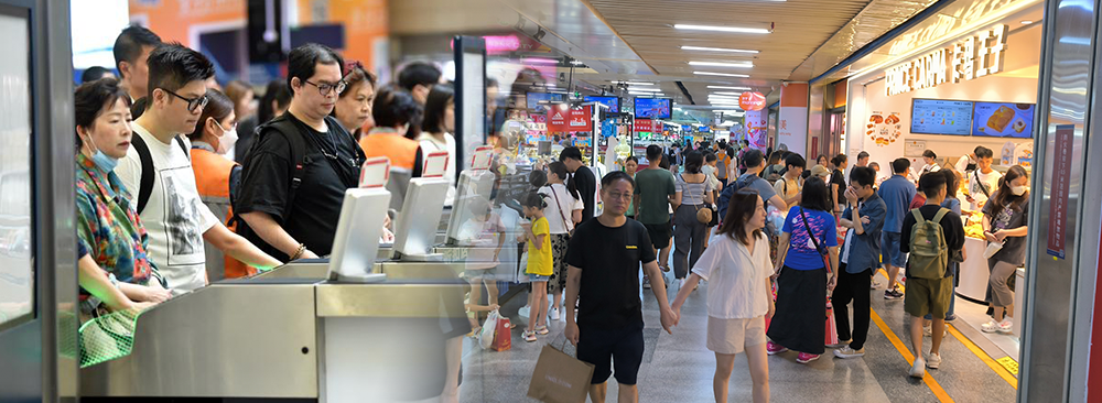 至於在超市購物方面,基於上述種種因素,一般國內的超市門面都比較大,除了價錢相對便宜之外,貨品種類亦比較多。一些大型超市更會有各類型的熟食攤位提供不同的美食予顧客,顧客甚至可以在超市購買新鮮的海產即時在超市內享用,這些服務是難以在香港提供的。