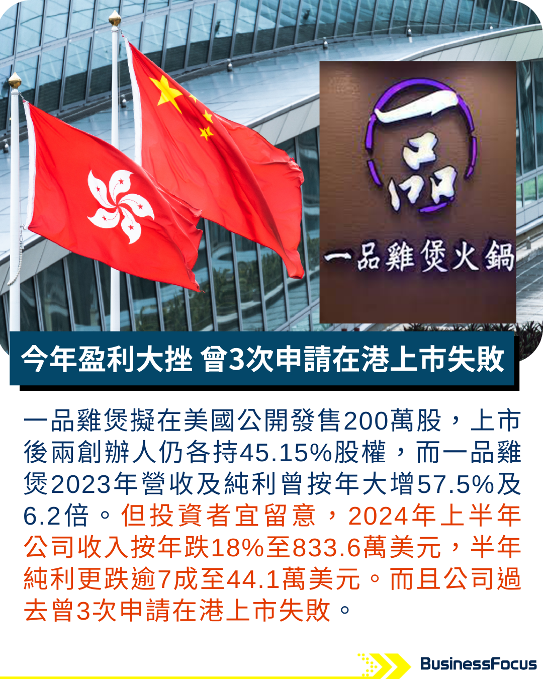 招股書資料顯示,「一品雞煲」收入曾急速增長,2023年全年營收約2,048萬美元,按年增長57.5%;純利約341.7萬美元,按年增長近6.2倍。但踏入2024年疑遇上旅遊及餐飲業寒冬,收入及盈利顯著放緩。其中2024年上半年收入833.6萬美元,按年跌18%;半年純利約44.1萬美元,按年下跌逾7成。集團表示若成功上市,集資所得(最多近1億港元)將用於拓展分店及網絡、建設新食品廠房、訓練中心、提升品牌知名度及一般營運等。