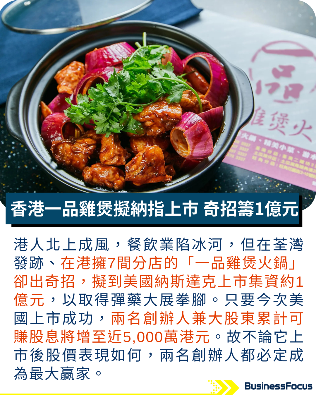 【香港雞煲變科技股?】一品雞煲奇招集資1億 擬美國納指上市 僅7分店 未上市股東先袋5000萬股息?