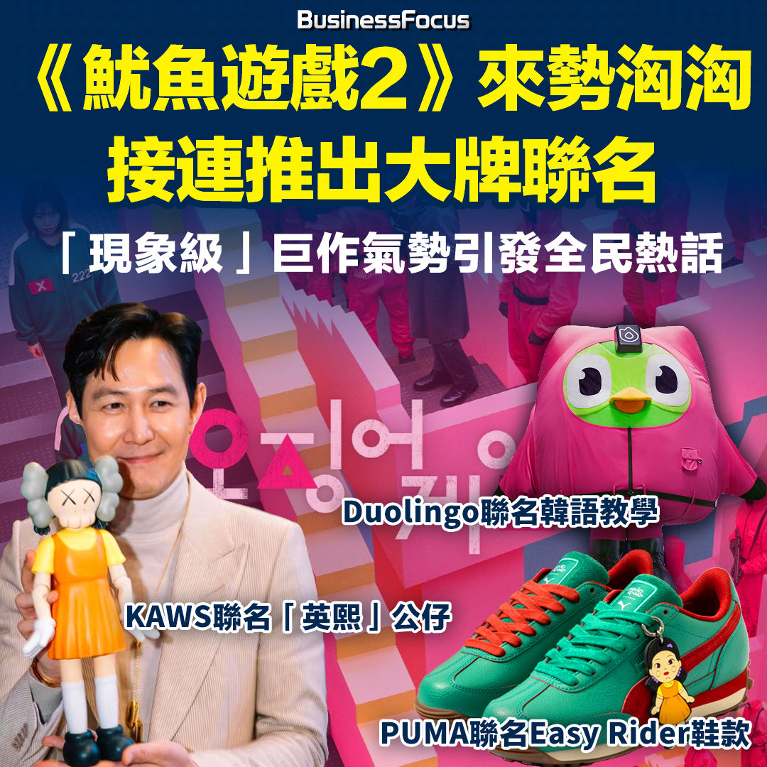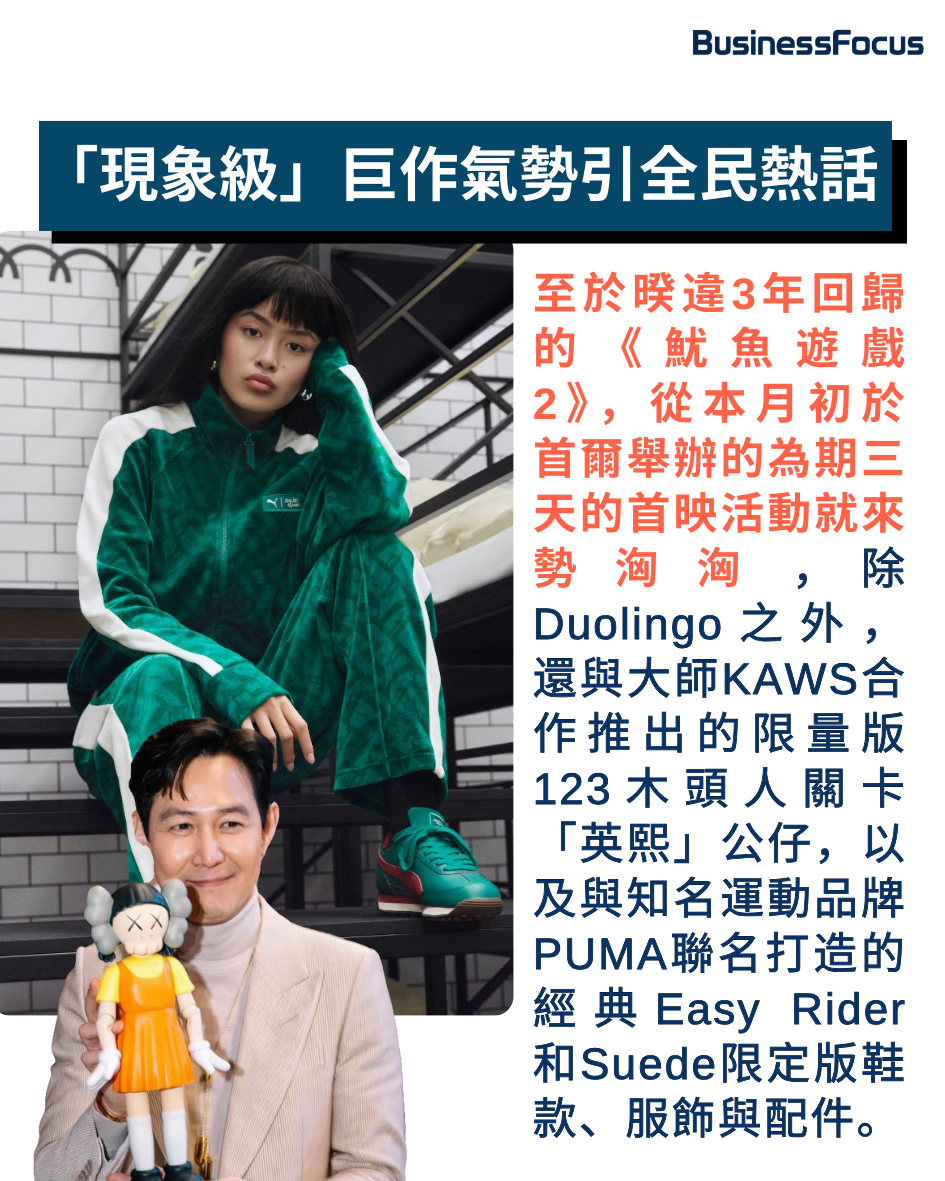 至於暌違3年回歸的《魷魚遊戲2》,從本月初於首爾舉辦的為期三天的首映活動就來勢洶洶,Netflix不惜砸重本讓來自全球的媒體、數位創作者以及Influencer齊聚一堂,只為將回歸巨作引向更洶湧的熱潮。除Duolingo之外,該劇集還與韓國國內外各領域企業進行合作,包括與韓國品牌Olive Young推出的聯名彩妝系列、與大師KAWS合作推出的限量版123木頭人關卡「英熙」公仔(售價320美元),以及與知名運動品牌PUMA聯名打造的經典Easy Rider和Suede限定版鞋款、服飾與配件。