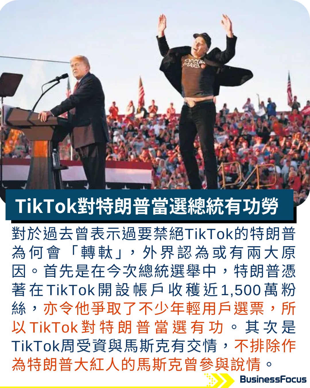 首先是在今次總統選舉中,特朗普於6月與TikTok「化敵為友」開設了官方社媒帳戶,並成功收穫近1,500萬粉絲及超過1億個讚好,亦令他成功爭取了不少年輕用戶選票,所以TikTok對特朗普當選有功。加上TikTok行政總裁周受資原來與特朗普身邊第一大紅人馬斯克甚有交情,早前周更曾與馬斯克聯絡及會面,疑似探底及求救。故不排除馬斯克曾說情,令特朗普研究是否放生TikTok。事實上若TikTok管理層日後作出「回報」,願站在特朗普及共和黨一方,對未來的共和黨選戰必有幫助。