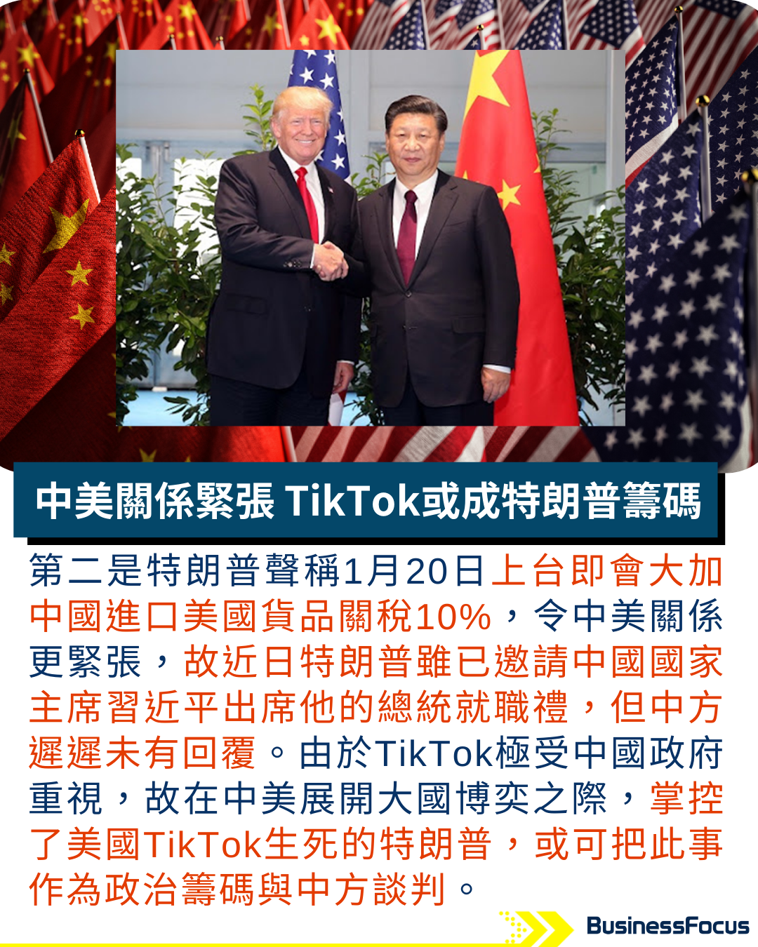 第二是特朗普上任總統所即,但由於他聲稱1月20日上台即會大加中國進口美國貨品關稅10%,令中美關係更緊張,故近日特朗普雖已邀請中國國家主席習近平出席他的總統就職禮,但中方遲遲未有回覆。有意見認為,在中美展開大國博奕之際,作為中國最強社交媒體的TikTok究竟會否被逐出美國,是中國領導層最關注議題之一。故完全掌控了美國TikTok「生死」的特朗普,或可把此事作為政治籌碼,與中國談判。