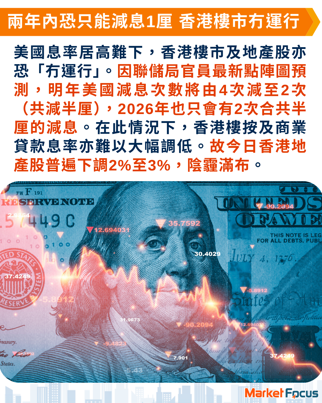美國息率居高難下,香港樓市及地產股亦恐「冇運行」,小業主及小商家再成受害人。因聯儲局官員最新點陣圖預測,明年美國減息次數將由4次減至2次(共減半厘),後年即2026年也只會有2次合共半厘的減息,這意味到了2026年息率只會較現在累減1厘,屆時聯邦基金利率目標區間料大約會位於3.25厘至3.5厘之間。在此情況下,香港樓按及商業貸款息率亦難以大幅調低。故今日香港地產股普遍下調2%至3%,陰霾滿布。