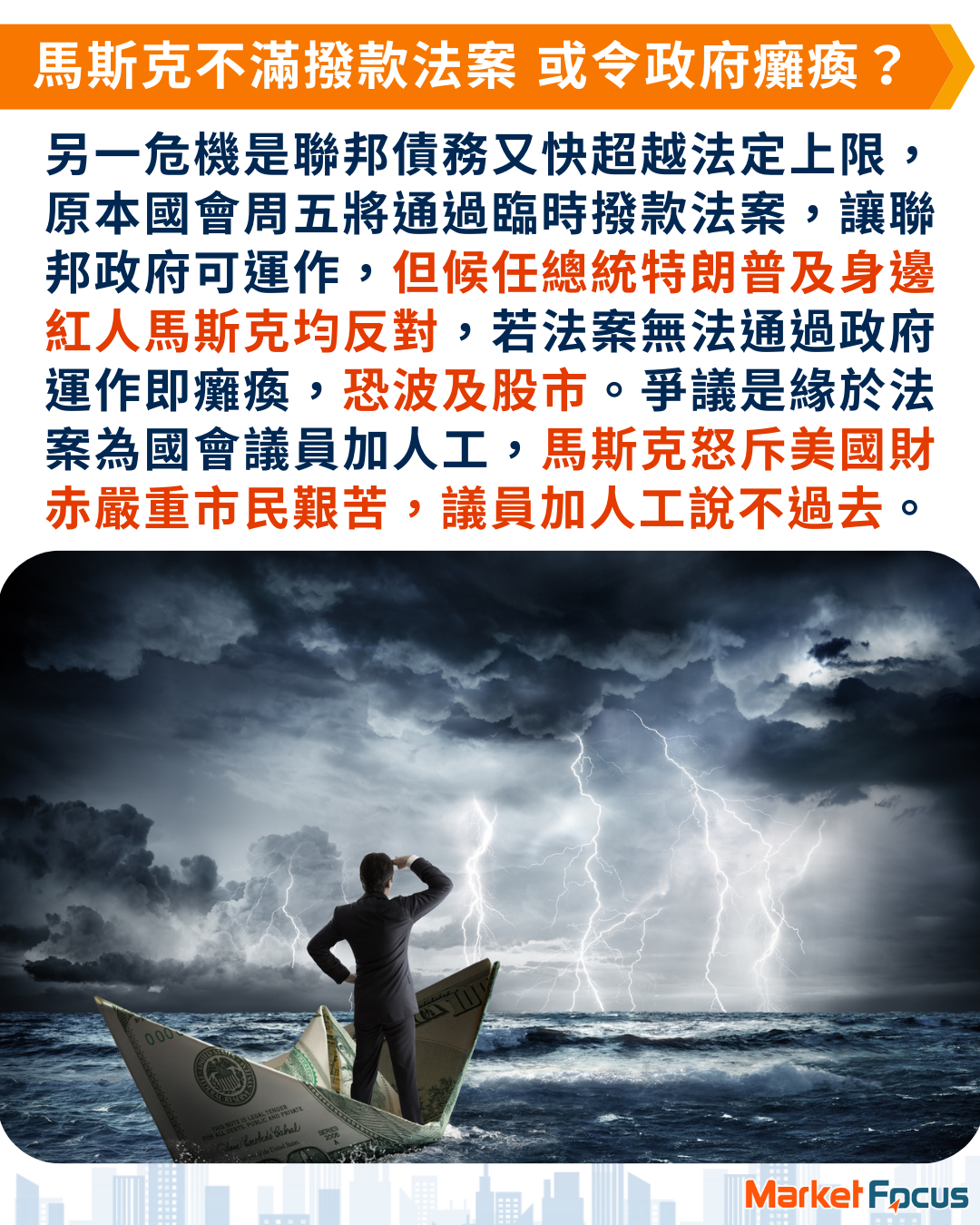 理由是美國的聯邦債務總額又快超越了上限,原本明日即周五會通過一項臨時撥款法案,為聯邦政府提供資金以運作至明年3月,但候任總統特朗普及其身邊紅人、全球首富馬斯克均公開反對,令人憂慮法案假如無法通過,政府非緊急運作即會癱瘓,並波及股市。今次的爭議是緣於法案包括了給國會議員加人工。馬斯克在社媒上連發超過20條帖文,全方位攻擊法案,認為國會議員在美國財赤嚴重的艱難時刻下加薪絕不恰當,因不少美國人仍為了聖誕節而苦苦工作掙錢。特朗普也公開譴責該法案,認為共和黨應該讓民主黨政府的虛張聲勢破產,並允許政府停擺。