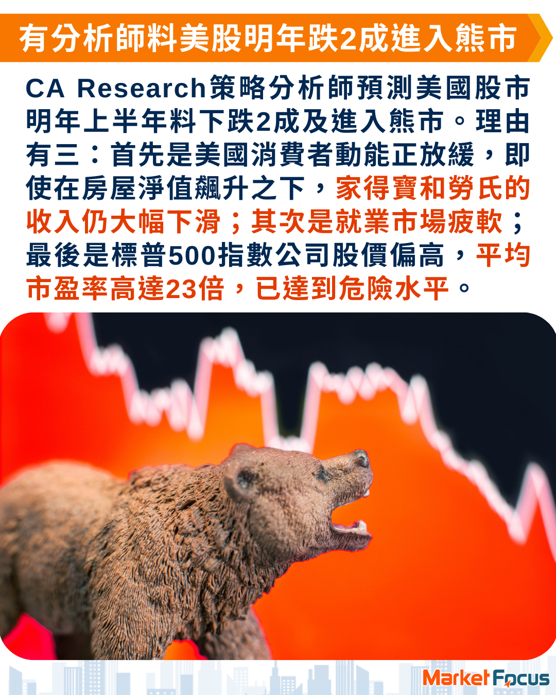 與此同時,開始有分析師預測明年美股會大跌及「入熊」。CA Research策略分析師預測,美國股市將在明年1月上漲,然後在明年上半年某個時候下跌超過2成,即進入熊市,投資人應該及早採取防禦性策略,並對沖風險。