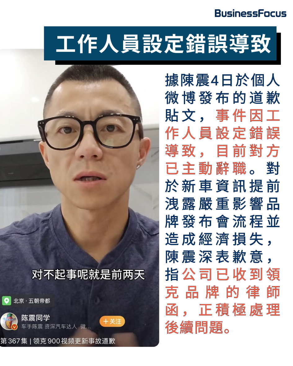 事後,陳震緊急於4日通過個人微博公開道歉並解釋,稱因工作人員設定錯誤,導致相關影片提前上傳,新車資訊提前洩露嚴重影響品牌發布會流程並造成經濟損失。陳震表示,公司已收到領克品牌的律師函,正積極處理後續問題。據稱,目前相關負責人員已主動辭職,公司將全面檢討及優化內容更新流程,杜絕此類事件的再次發生。