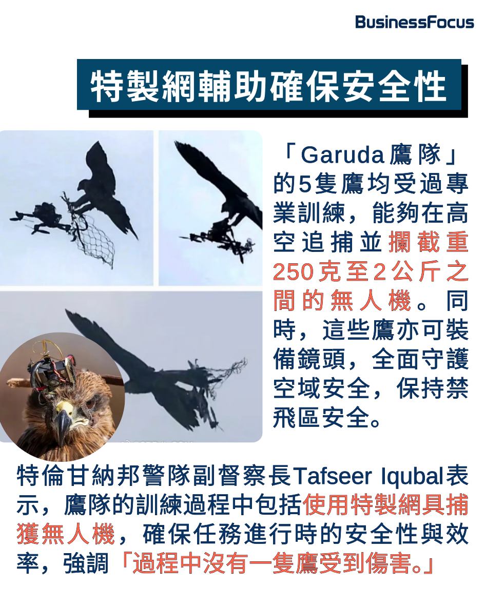 有關鷹隊有可能在抓擊過程中被無人機螺旋槳所傷的問題,Tafseer Iqubal表示鷹隊的訓練過程中包括使用特製網具捕獲無人機,並將其拖至指定安全區域,確保任務進行時的安全性與效率,強調「過程中沒有一隻鷹受到傷害。」