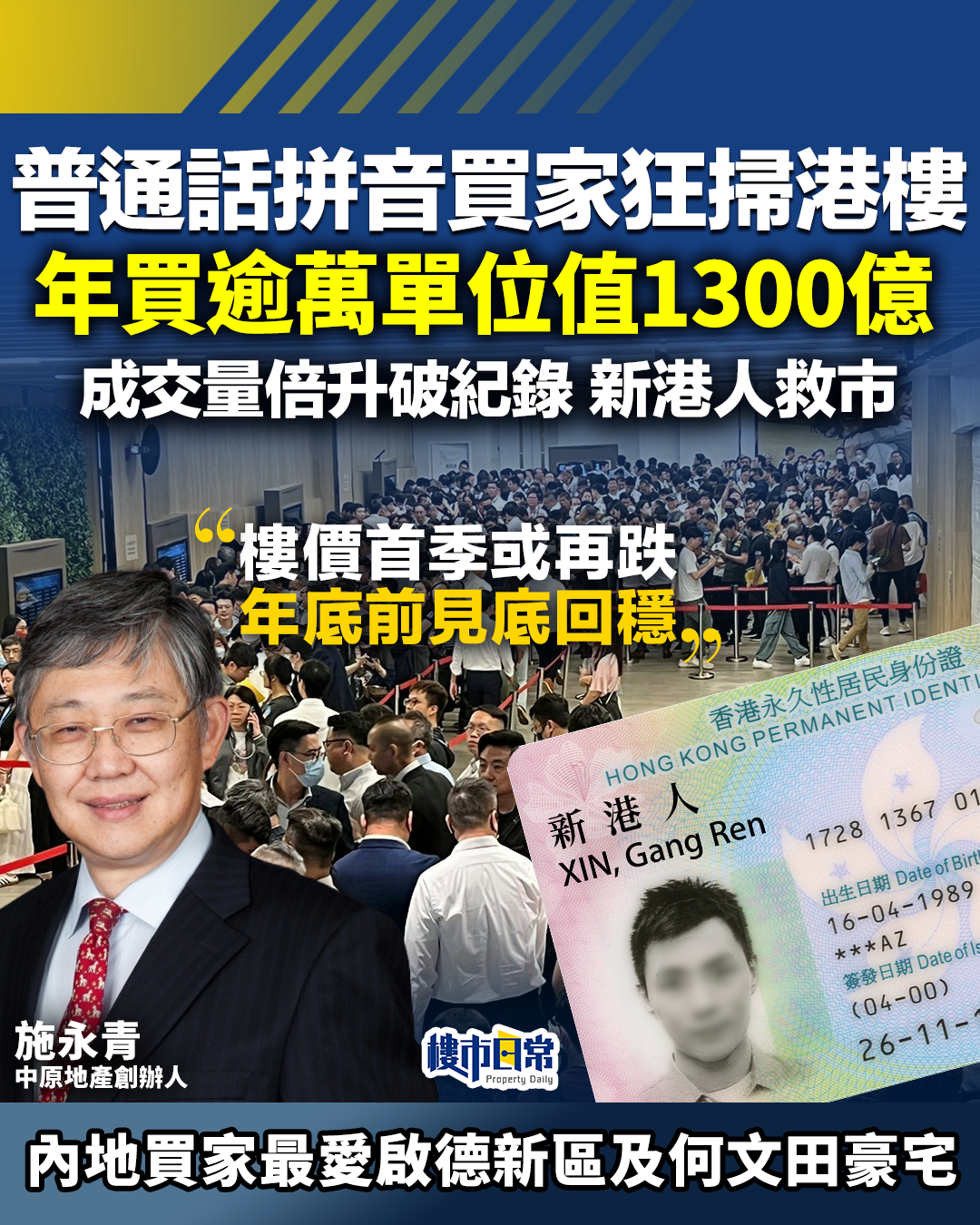 【樓市曙光】普通話拼音買家狂掃港樓 年買1.1萬單位值1300億 成交量倍升破紀錄 新港人救市 施永青料樓價首季再跌 年尾或可回穩
