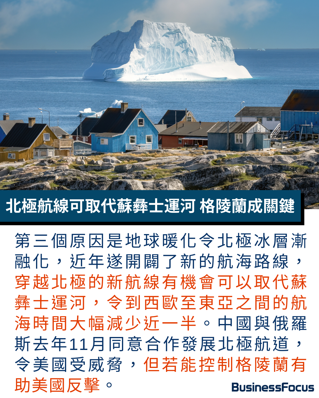 地球暖化令北極冰層漸融化,近年遂開闢了新的航海路線,穿越北極的新航線有機會可以取代蘇彝士運河,令到西歐至東亞之間的航海時間大幅減少近一半。而中國與俄羅斯在去年11月剛剛同意合作發展北極航道,令美國感受威脅。但假如美國成功控制格陵蘭,既可自保,亦可機會藉此阻撓中俄計劃中的北極航道發展大計。