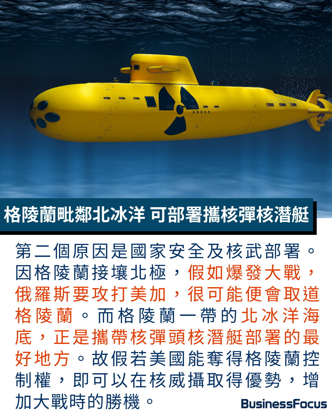 格陵蘭接壤北極,地理及戰略位置極為重要。假如爆發第三次世界大戰,俄羅斯要攻打美、加,很可能便會取道格陵蘭。此外格陵蘭一帶的北冰洋海底,亦是攜帶核彈頭的核潛艇部署的最好地方。故假若美國能「佔領」或奪得格陵蘭控制權,便可以在核威攝方面取得優勢,牽制俄國斯及中國。