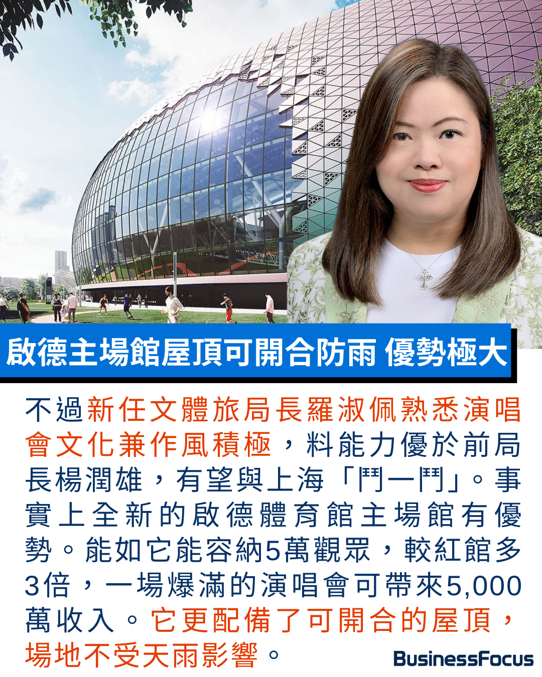 本來從旅遊基建上來說,香港難敵上海,例如上海迪士尼樂園面積遠大於香港,上海更不斷增加旅遊設施,包哈正極力爭取哈利波特及小豬佩奇主題樂園落戶上海。但香港全新的啟德體育館主場館卻有數大優勢。首先是它的東方之珠「幻彩外牆屏幕」設計在國際具知名度,更重要的是它能容納5萬觀眾,較紅館的1.25萬座位多3倍,以平均一張門票1,000元推算,一場爆滿的演唱會已可帶來5,000萬收入,對國際歌手也具吸引力。