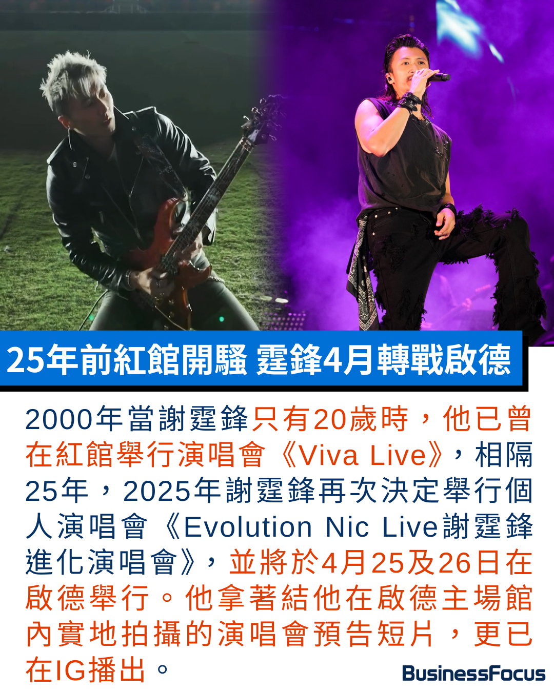 相隔25年,2025年謝霆鋒再次決定舉行個人演唱會《Evolution Nic Live謝霆鋒進化演唱會》,並將於4月25日及26日在啟德主場館舉行。值得留意的是,台灣歌星周杰倫的啟德演唱會今年6月才舉行,故謝霆鋒將成為首位登陸啟德主場館開演唱會的香港以及亞洲歌手。