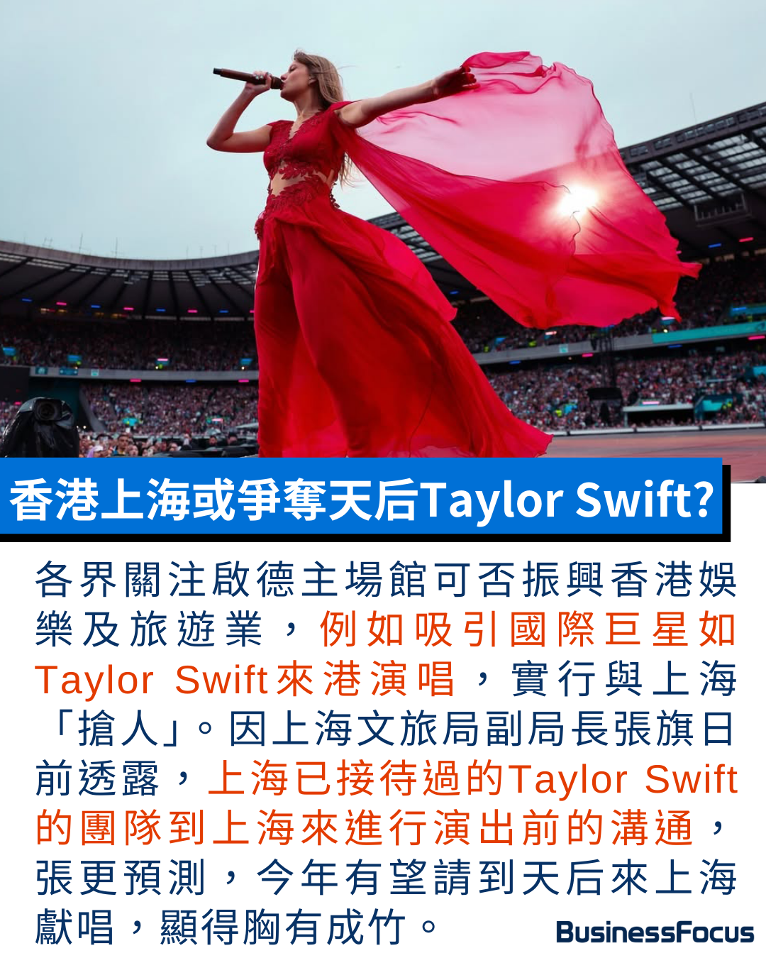 說要與上海「搶人」並不誇張,因上海文旅局副局長張旗日前透露,上海已接待過的Taylor Swift的團隊到上海來進行演出前的溝通,張更樂觀表示,今年有希望請到天后來上海獻唱,似展示上海的優勢。不過幸運的是,疑「不屑」爭取國際歌星來港、更戲言自己沒有Taylor Swift電話號碼的前文化體育及旅遊局長楊潤雄上月已被「炒魷」,而新任文體旅局長羅淑佩熟悉演唱會文化兼作風積極,料有機會與上海「鬥一鬥」。