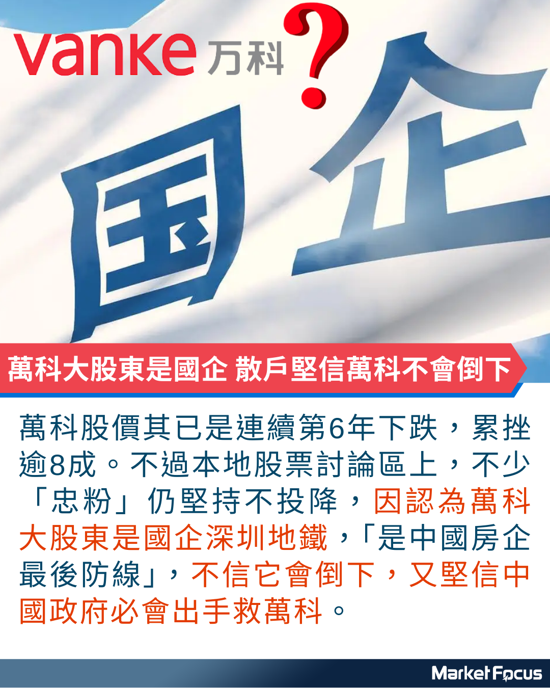 至今日正午收市,萬科企業(2202)報4.56元,跌幅略收窄至6.2%。其實萬科因債務沉重加上賣樓收入大減,已超過1年半沒有派息,股價更是連續第6年下跌。昨日4.86元收價,即較2009年收市價28.752元暴瀉逾8成,投資者損失慘重。不過本地股票討論區上,不少「忠粉」今早仍堅持不投降,甚至考慮撈底,因認為萬科大股東是國企深圳地鐵,「是中國房企最後防線」,不信它會倒下。他們又認為中國政府必會出手救萬科,「萬科股價可以跌、但不會崩」。