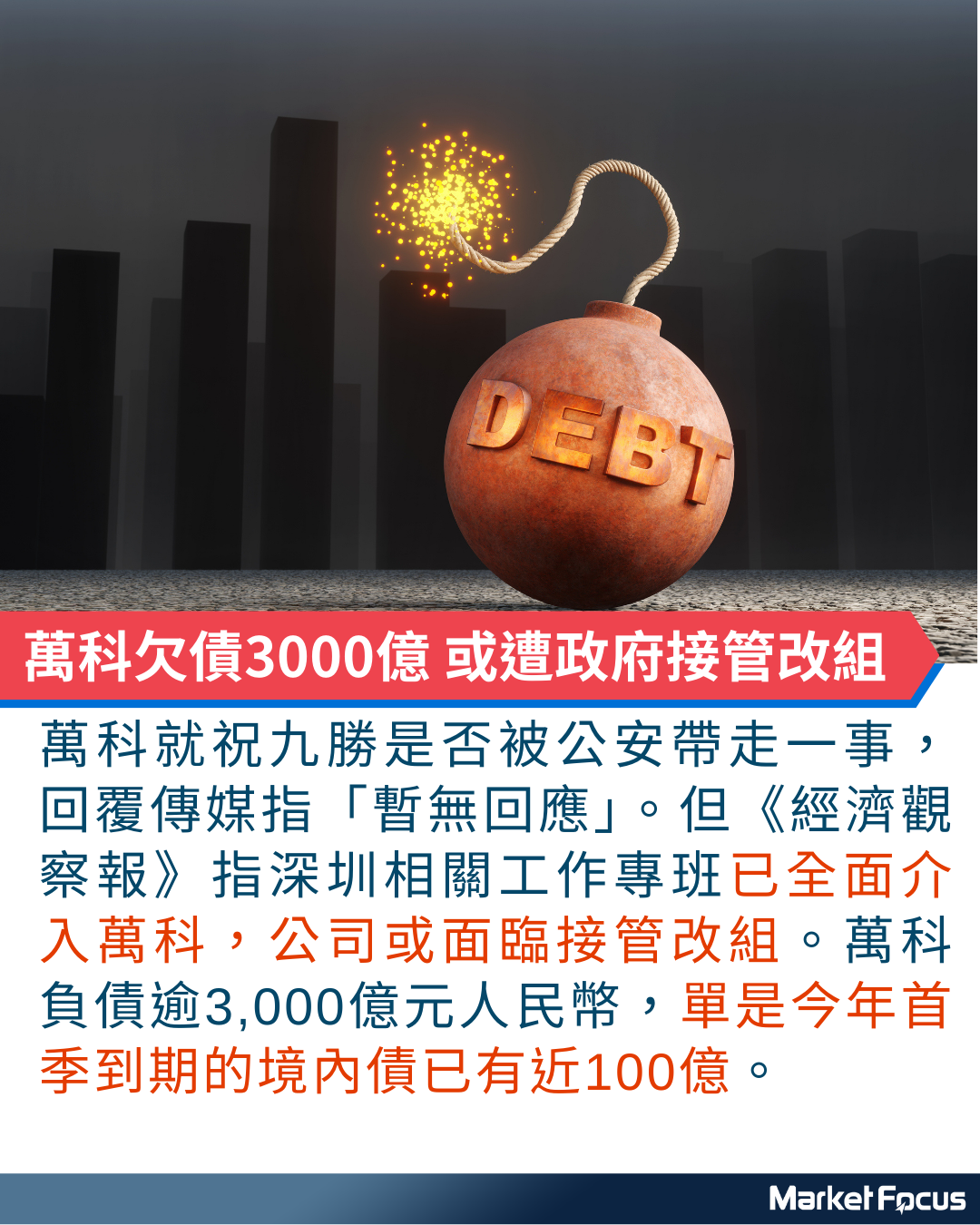 大股東為國企深圳地鐵、曾被譽為「內房最後防線」的萬科企業(2202)也有爆煲風險?負債逾3,000億人民幣的萬科企業,昨傳出公司總裁兼首席執行官(CEO)祝九勝遭公安機關帶走,萬科直至今日仍未澄清,觸發其股價今早曾大跌9%。萬科發行的部分境內債券昨日更一度跌停板,價格大瀉2至3成。有內媒指萬科有可能被內地政府接管及改組,外界憂這內房股有債務違約風險。