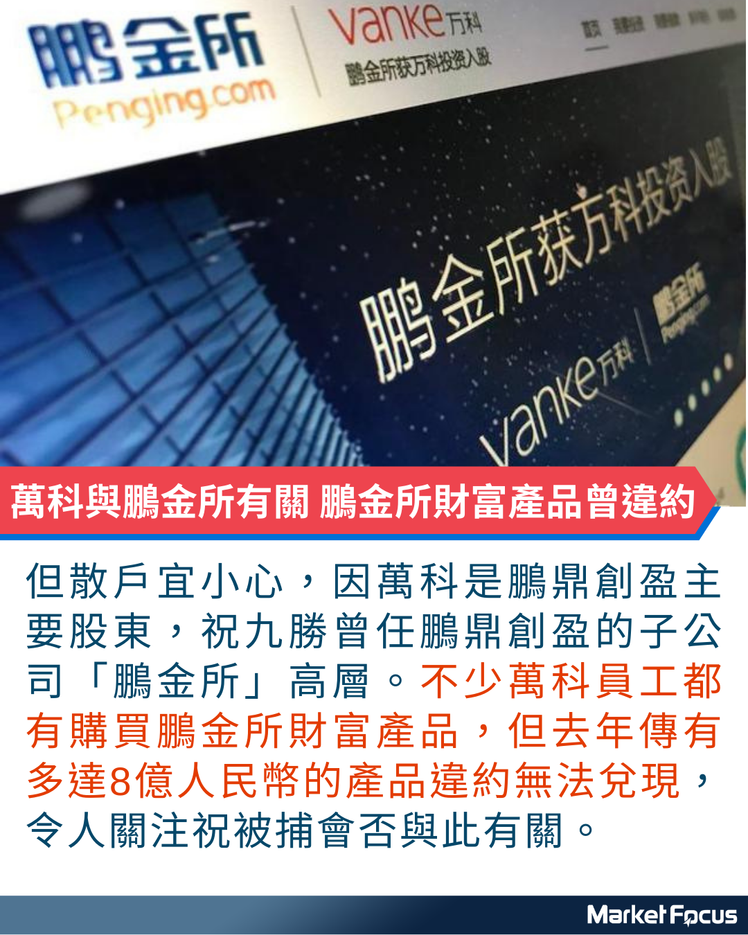 【國企撐腰內房也爆煲?】內房最後防線也失守 傳萬科總裁祝九勝遭帶走 公司或遭接管 負債3千億 公司債急瀉3成 鵬金所爆煲8億財富產品違約成導火線?