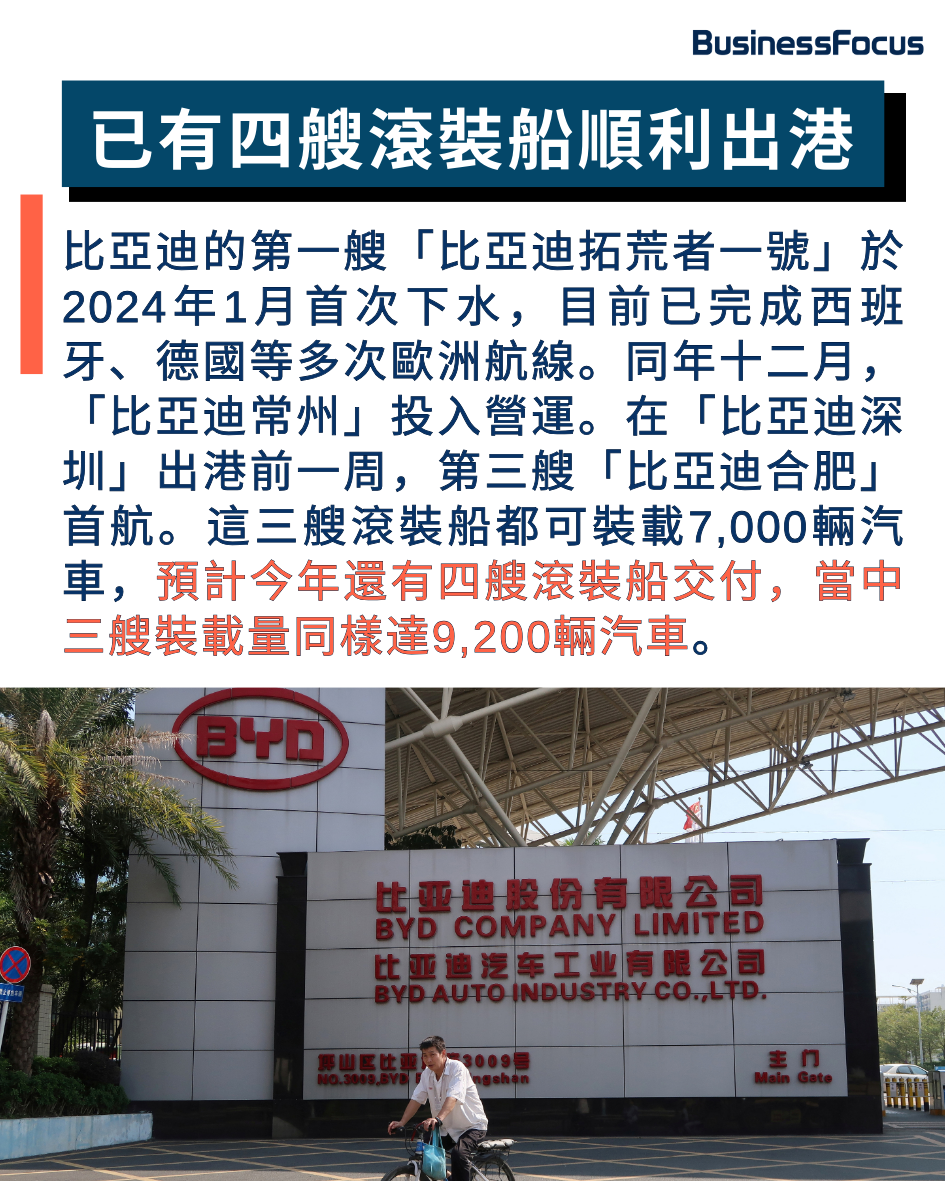 自去年起至今,比亞迪的汽車滾裝船已四次成功出港。第一艘「比亞迪拓荒者一號」於2024年1月首次下水,目前已完成西班牙、德國等多次歐洲航線。同年十二月,「比亞迪常州」投入營運。在「比亞迪深圳」出港前一周,第三艘「比亞迪合肥」首航。這三艘滾裝船都可裝載7,000輛汽車,預計今年還有四艘滾裝船交付,當中三艘裝載量同樣達9,200輛汽車。