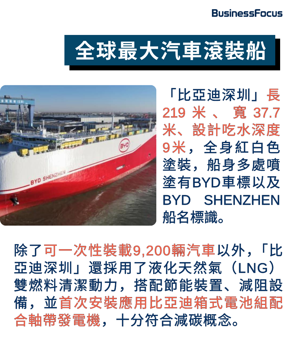 比亞迪製造的全球最大滾裝船「比亞迪深圳」日前於揚州正式出港,一次裝載了9,200輛汽車。這是比亞迪的第四艘汽車滾裝船,首次安裝了比亞迪新能源車綠色環保、智慧高效等技術優勢,堪稱最環保滾裝船。「比亞迪深圳」是次成功出港,不僅為中國能源汽車的出口提供了新動力,更展示了中國在汽車運輸船領域的製造實力,有望進一步提升中國新能源車在全球市場的份額。