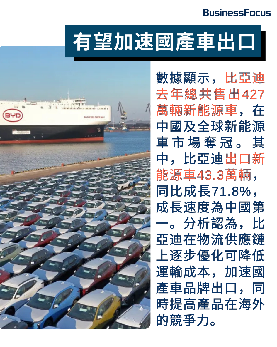 數據顯示,比亞迪去年總共售出427萬輛新能源車,在中國及全球新能源車市場奪下銷售冠軍。其中,比亞迪出口新能源車43.3萬輛,較去年成長71.8%,成長速度為中國第一。分析認為,比亞迪在物流供應鏈上逐步優化可降低運輸成本,加速國產車品牌出口,同時提高產品在海外的競爭力。