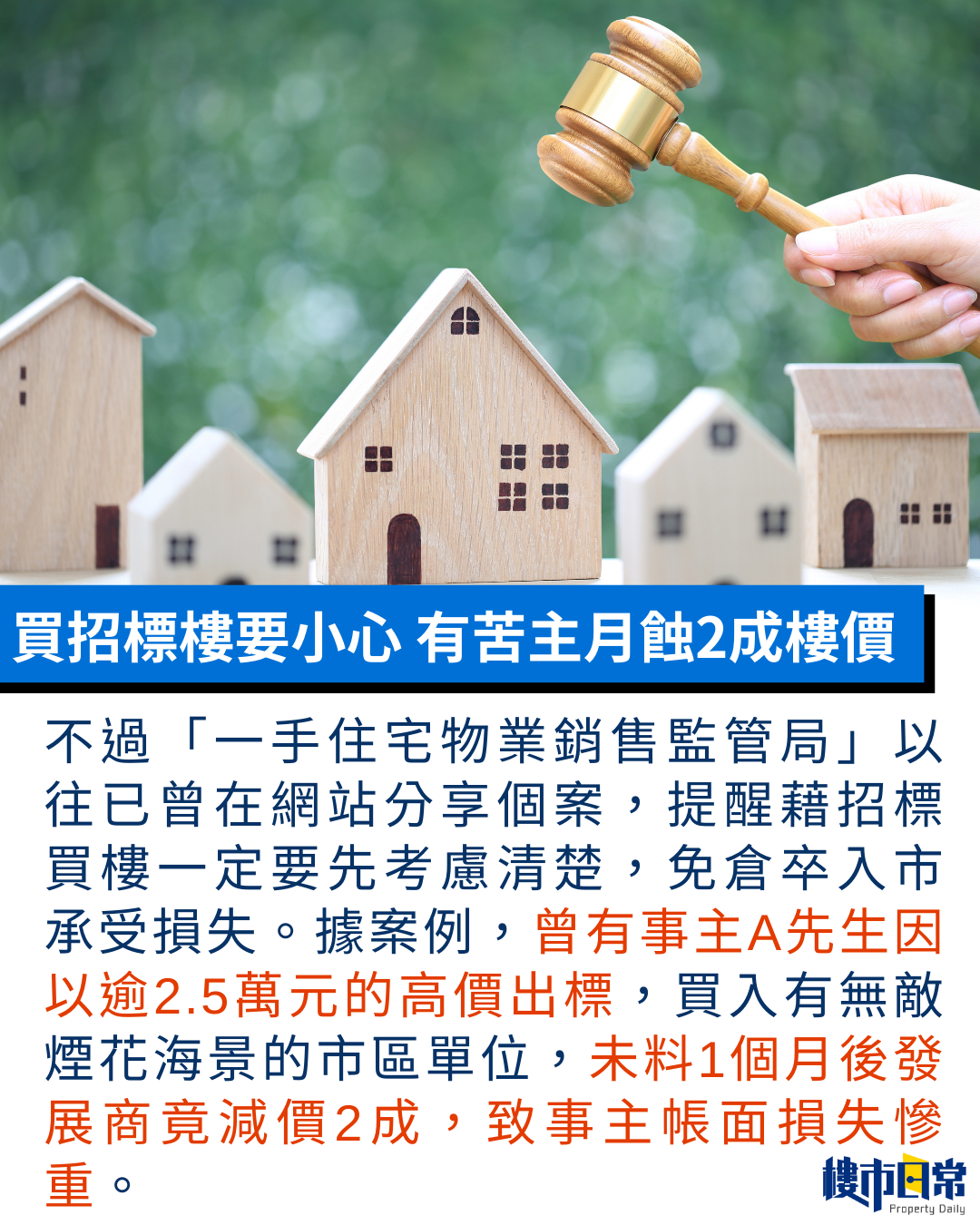 不過「一手住宅物業銷售監管局」以往已曾在網站分享苦主個案,提醒以招標方式買樓之前,一定要先研究及考慮清楚,以免倉卒入市承受損失。據案例,曾有事主A先生因心儀一個有無敵煙花海景的市區單位,以超過2.5萬元的意向呎價出價,結果藉招標成功買入單位。未料大約一個月之後同一發展商再推單位時,呎價竟大減2成至約2萬元,令事主帳面損失慘重。