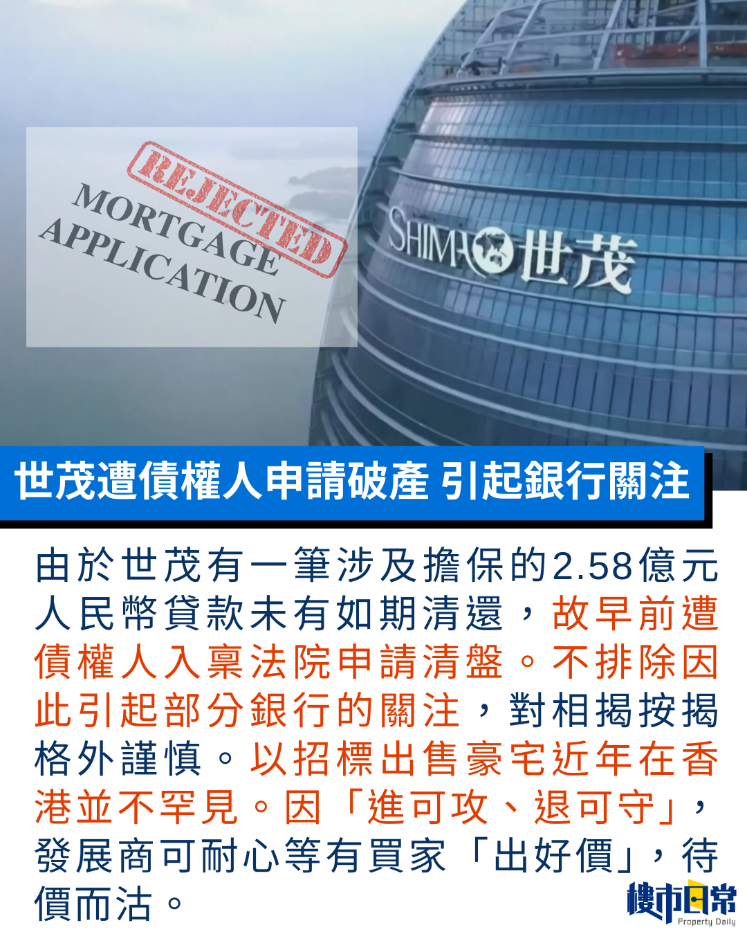 上述招標出售的單位由於已落成,相信沒有爛尾風險,不過由於世茂集團(0813)有一筆涉及擔保的2.58億元人民幣貸款未有如期清還,如同債務違約,故早前遭債權人入稟香港法院申請清盤。不排除因此引起部分銀行的關注,有銀行遂決定不承接相關招標樓盤的按揭申請,引起地產業界人士議論紛紛。