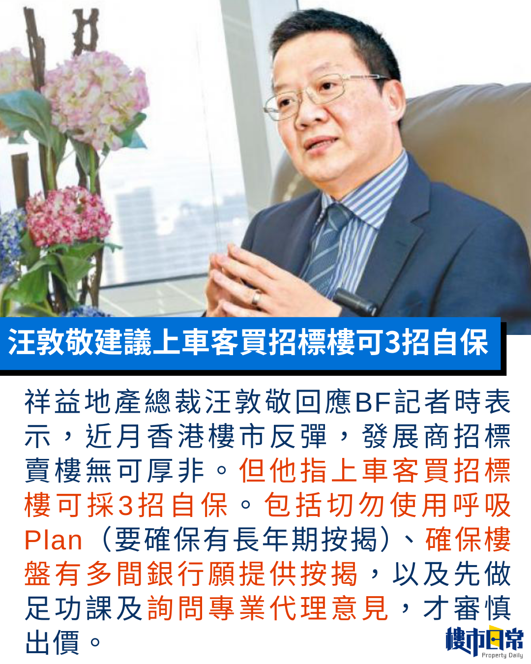 無論買樓花又或是招標現樓,汪敦敬認為買家都應盡量選擇一些有多間銀行提供按揭的項目。因為若有多間銀行願提供按揭,顯示銀行已為該地產項目投下信心一票。