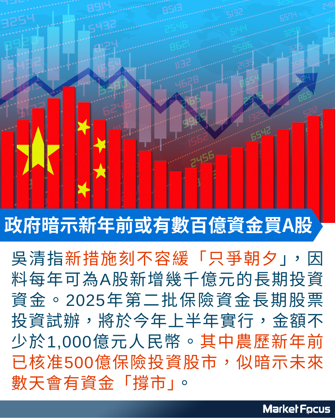 吳清稱,要求大型國有保險公司今年開始每年新增保費的30%用於投資A股。意味著從今開始,每年會至少為A股新增幾千億元的長期投資資金。其中2025年第二批保險資金長期股票投資試辦,將在今年上半年落地,資金規模將不低於1,000億元人民幣。當局又透露,在農曆新年前已核准500億元投資股市,似暗示未來數天這些資金會「撐市」。