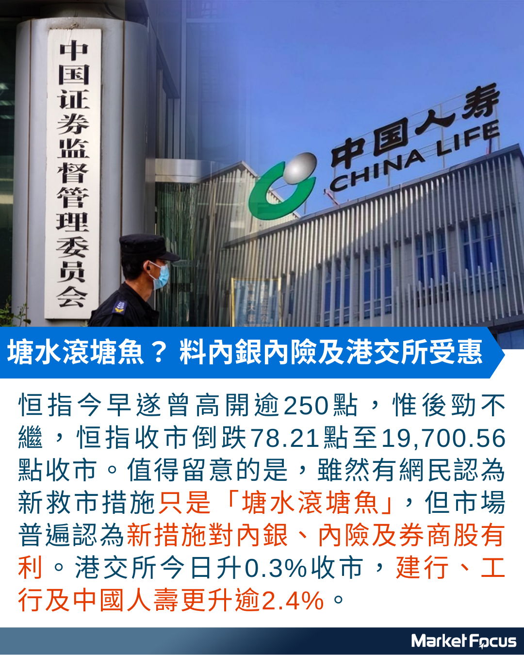 證券界預期這有助穩定A股市場及增加股市成交額。恒指今早遂高開,最多曾升265.29點,惟後勁不繼,恒指收市倒跌78.21點至19,700.56點收市,2萬點大關得而復失。值得留意的是,雖然有網民認為新救市措施只是「塘水滾塘魚」,但市場普遍認為新措施對內銀、內險及券商股有利。故港交所(0388)今日升0.3%收市,建行(0939)、工行(1398)及中國人壽(2628)更升逾2.4%,在跌市中成為升幅最高的3大藍籌股。