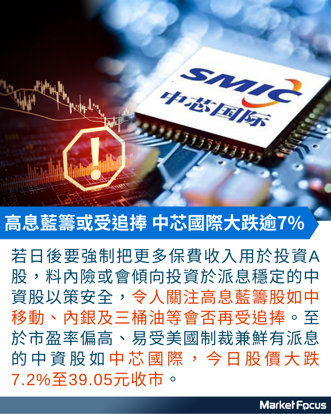 此外,中港股市近年跌多升少,若日後要強制內險公司把更多保費收入用於投資A股,料內險或會傾向投資於派息穩定的大藍籌或大紅籌以策安全,以確保能取得股息收入派發給投保人,令人關注高息紅籌股如中移動(0941)、內銀及三桶油等未來會否再受追捧。至於市盈率偏高、易受美國制裁兼鮮有派息的中資股未來動向亦令人關注。受中央力捧但市盈率高逾70倍的中芯國際(0981),今日股價即大跌7.2%至39.05元收市。