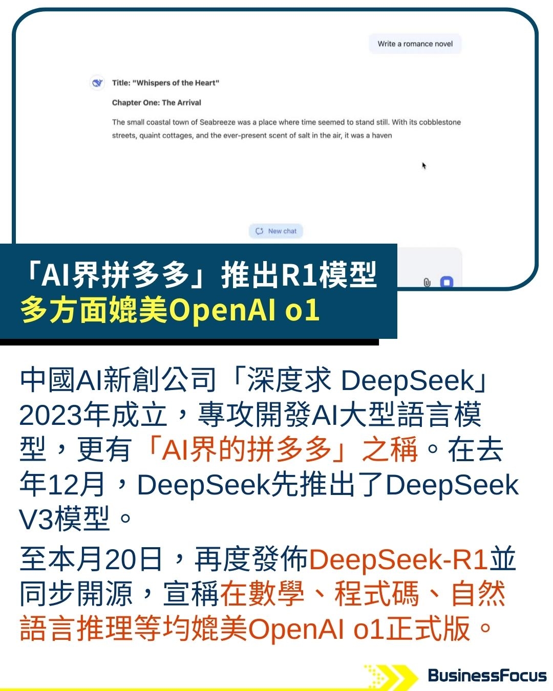 中國AI新創公司「深度求索(DeepSeek)」,在2023年成立,總部設於中國浙江省杭州市,專攻開發AI大型語言模型,更有「AI界的拼多多」之稱。在去年12月,DeepSeek先推出了DeepSeek V3模型。至本月20日,再度發佈DeepSeek-R1,並同步開源模型,宣稱效能與OpenAI o1正式版對齊。 消息一出,在全球AI界引起討論。
