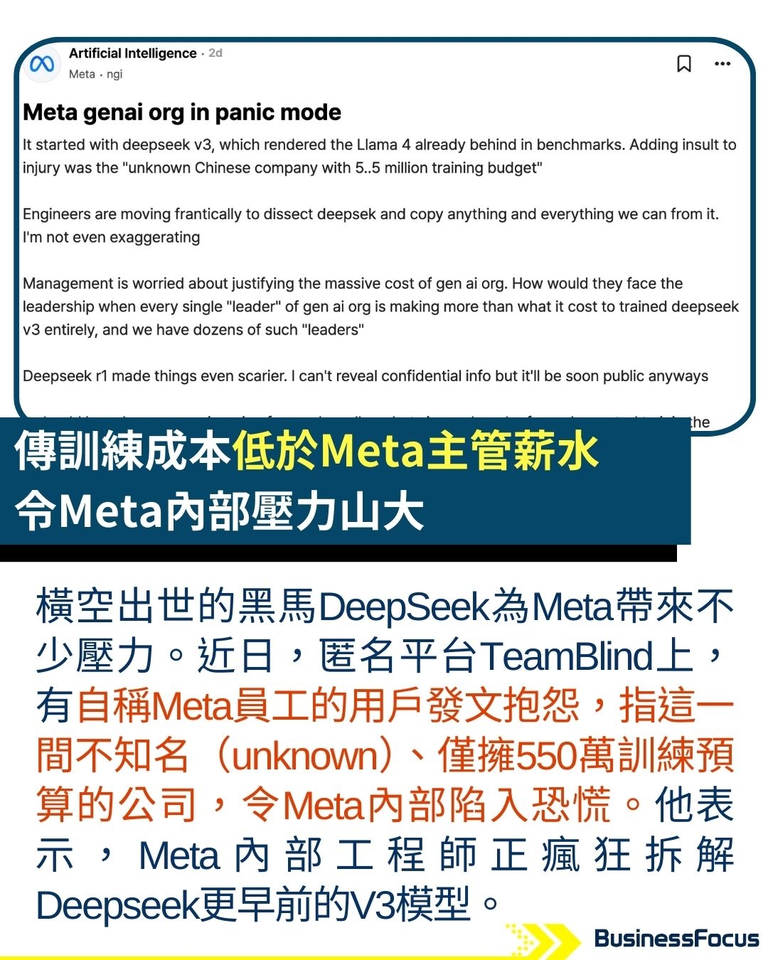 Meta內部壓力山大 Deepseek訓練成本比主管薪水還低