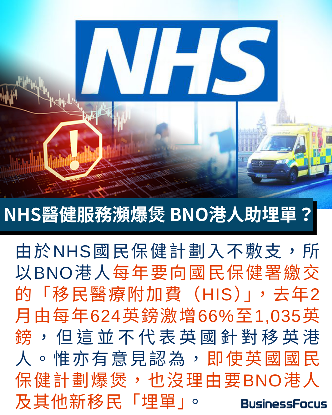 但也有網民為英國政府護航,指BNO簽證港人移民英國總支出激增,主因是NHS國民保健計劃瀕崩潰,入不敷支、醫護人手嚴重不足。所以BNO港人每年要向國民保健署繳交的「移民醫療附加費(HIS)」,去年2月由每年624英鎊激增66%至1,035英鎊,這顯示英國絕非針對移英港人。但亦有意見認為,即使英國NHS國民保健計劃爆煲,也沒理由要BNO港人及其他新移民「埋單」。