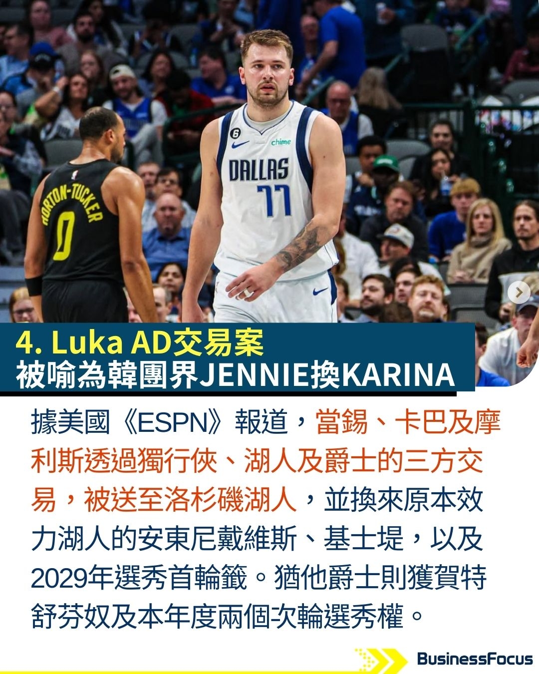 消息一出,震驚全球各地球迷。事關被交換的當錫、戴維斯均為兩隊重要球員,更有網民用南韓兩大女團門面互換作比喻,指驚訝程度如同Blackpink JENNIE換Aespa KARINA,即使是沒有關注NBA的球迷相信也能秒懂,更有網民比喻是把姜濤換到TVB。